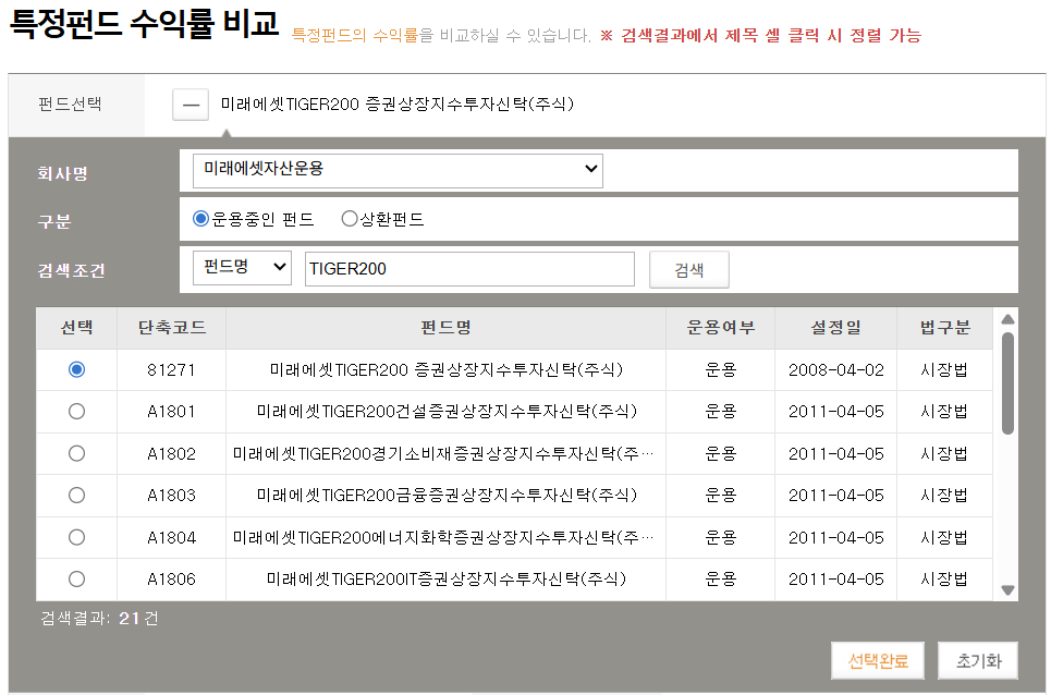 - [특정펀드 수익률 비교] 메뉴 선택